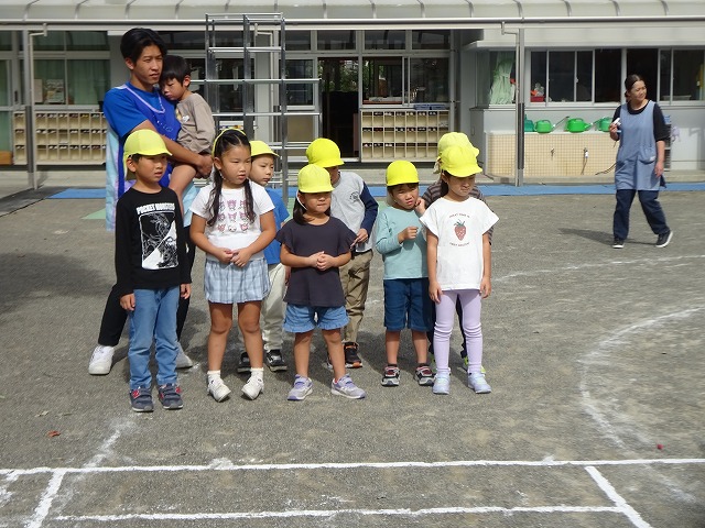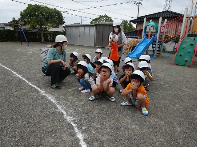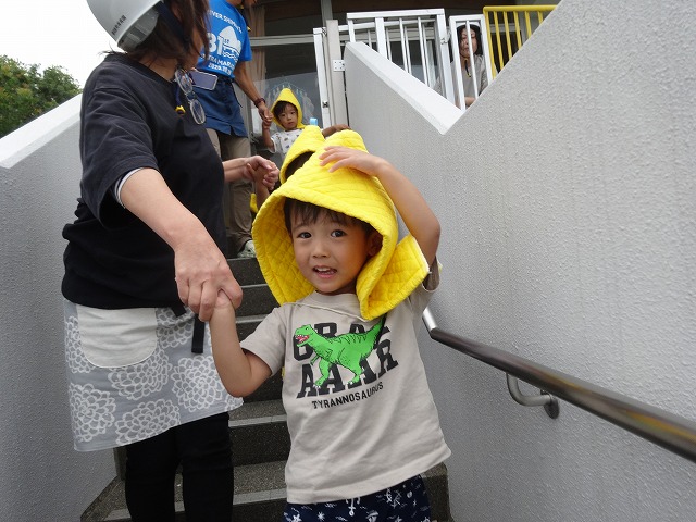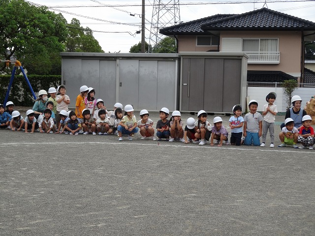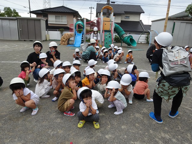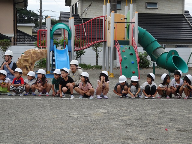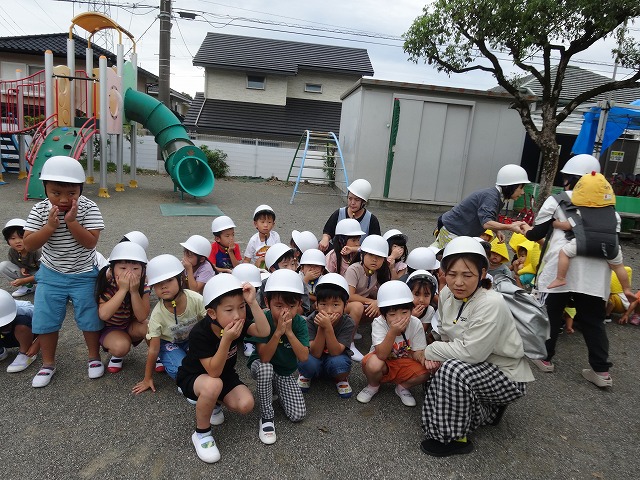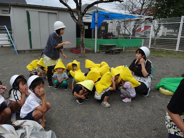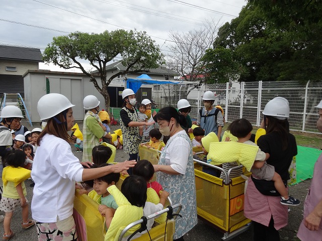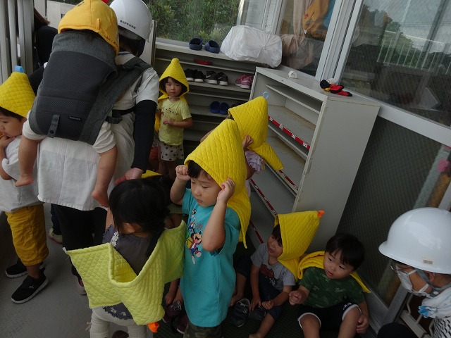 乳児組さんは防災頭巾、幼児組さんはヘルメットを被ります