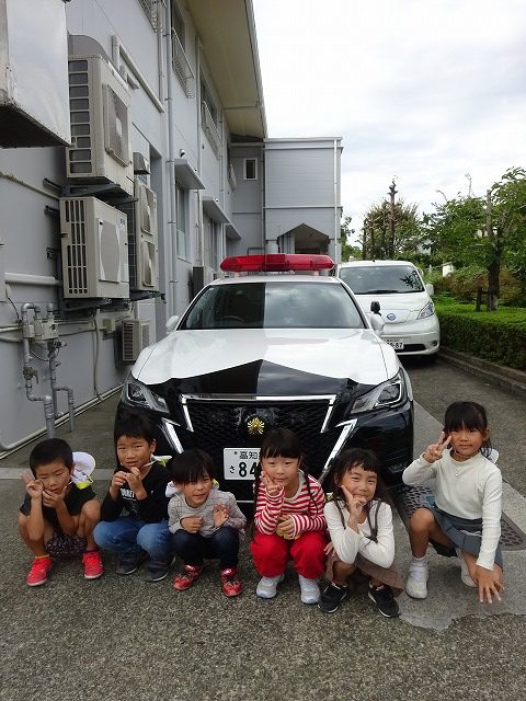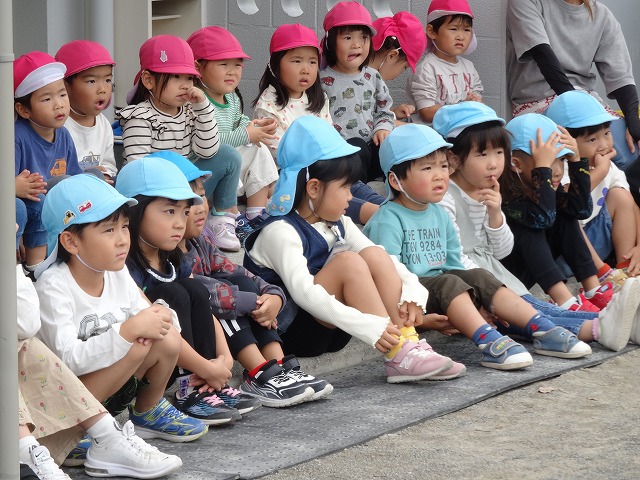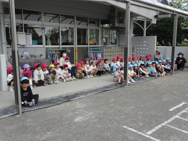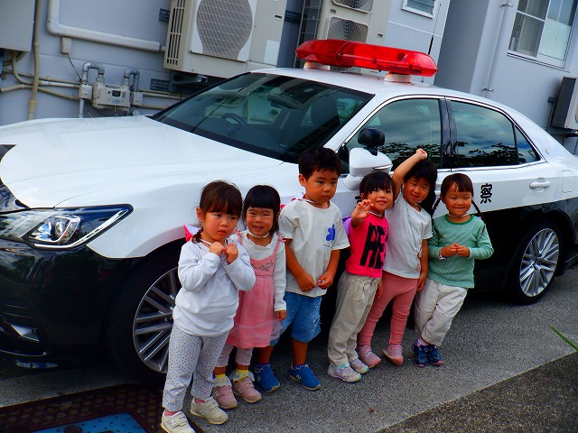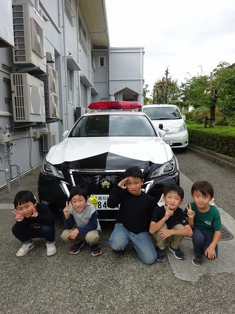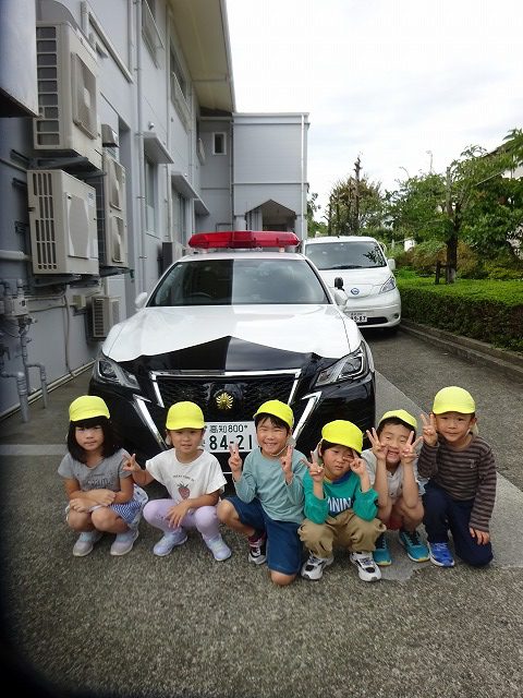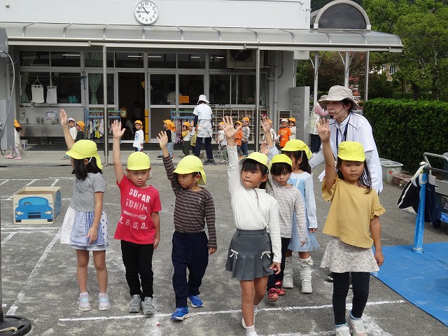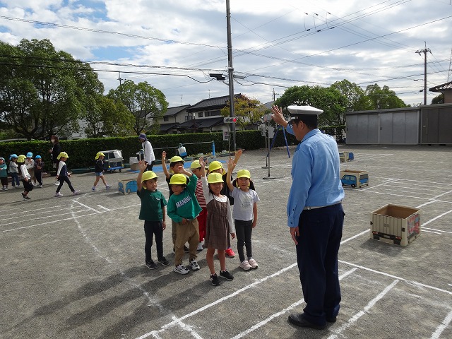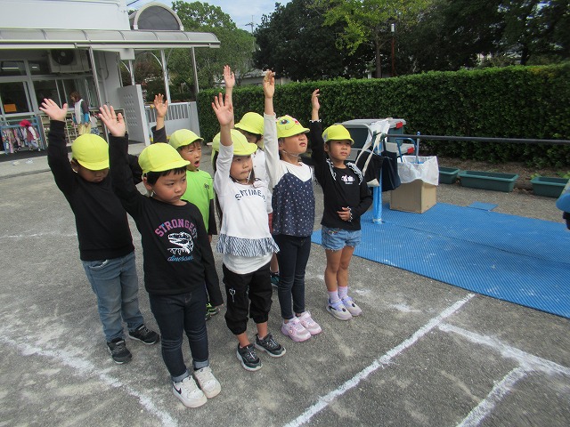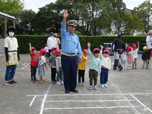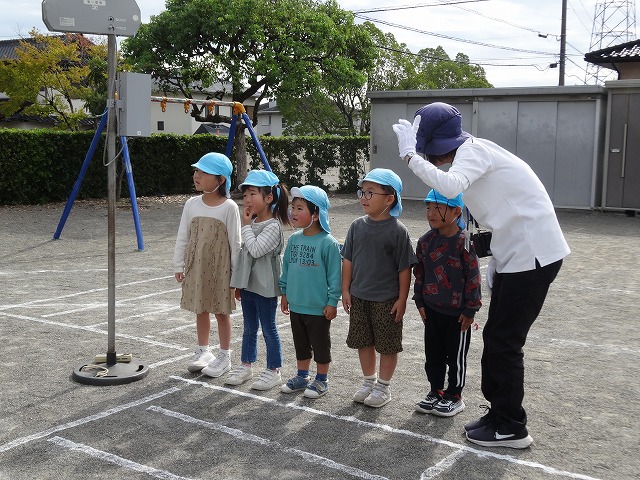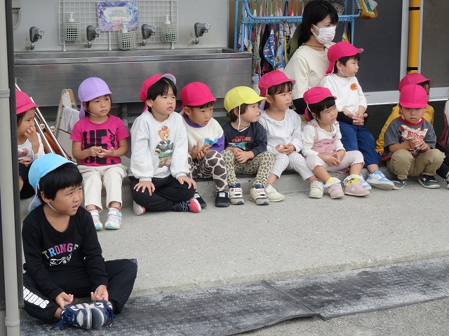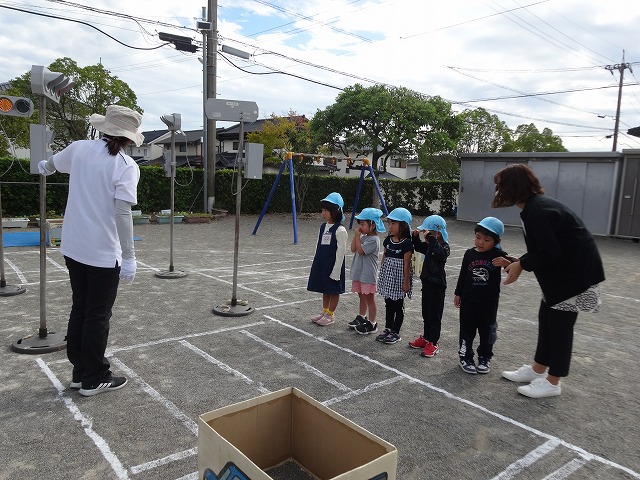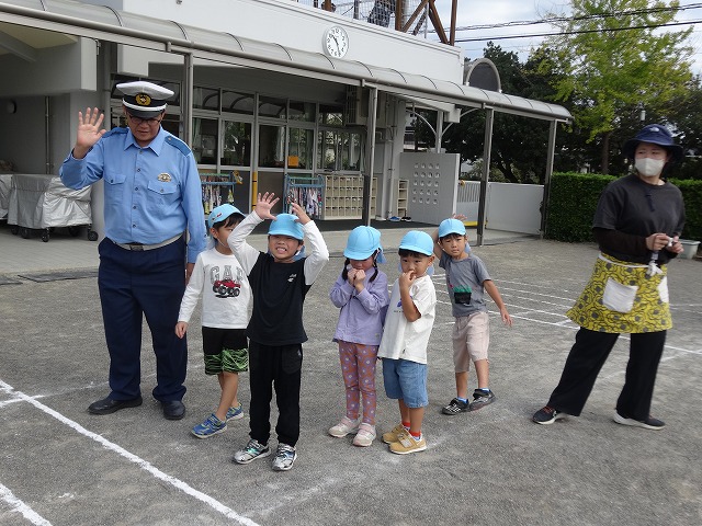 10月24日(金)、すみれ組(3歳児)、ゆり組(4歳児)、ひまわり組(5歳児)の子どもたちが、交通安全教室に参加しました。
