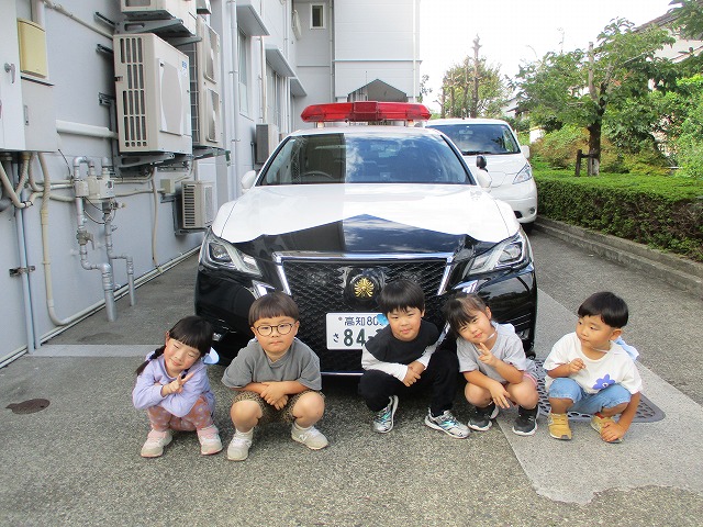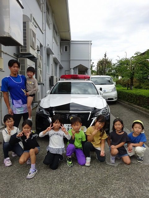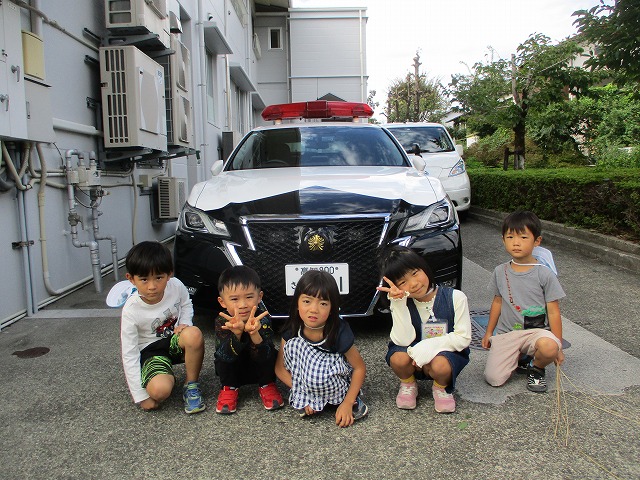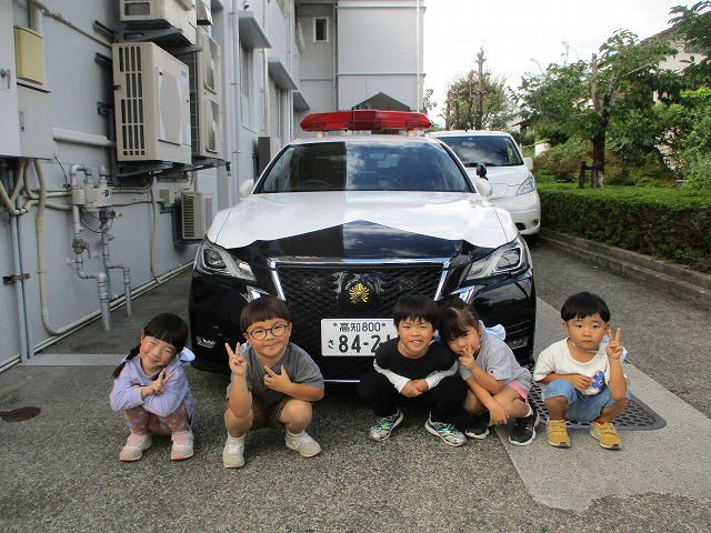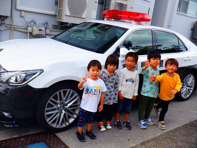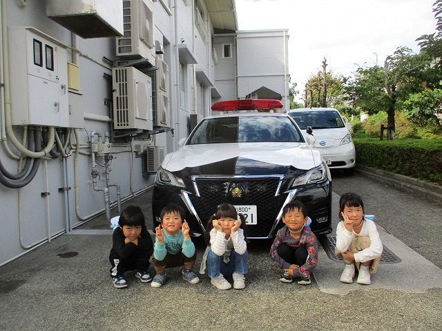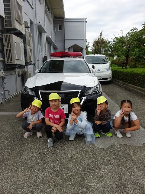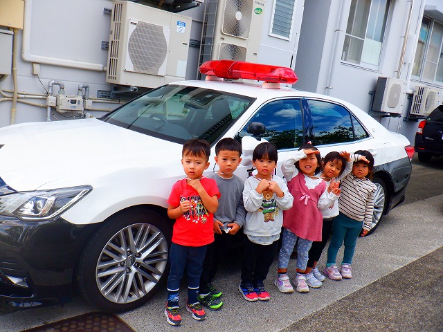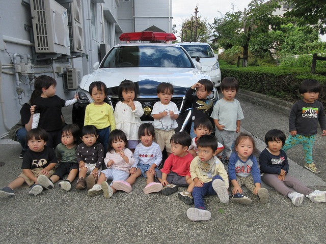 もも組さんは、お散歩から帰ってきてパトカーを見学していましたよ😊間近に見るパトカーにうっとり💕