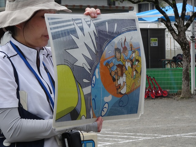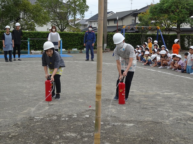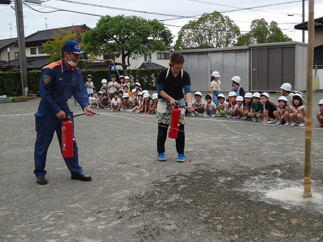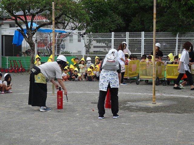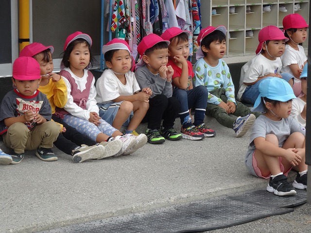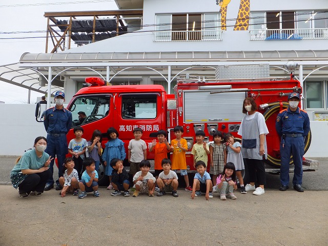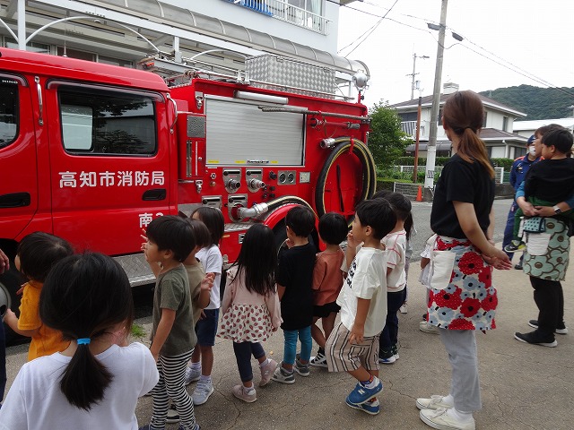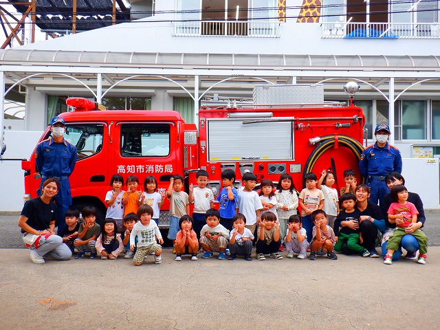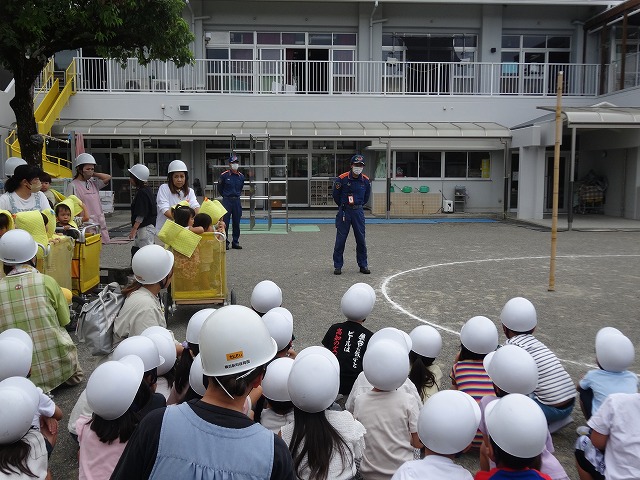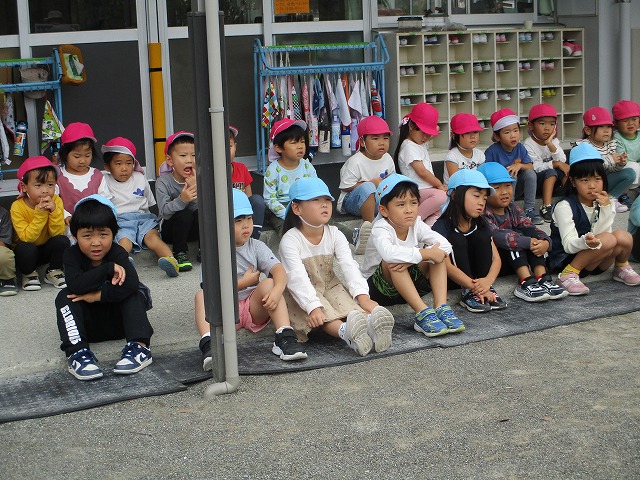 消防士さんが「おさない、はしらない、しゃべらない、もどらない」の意味を確認していると、しゃべらないは「先生のはなしを聞けんなるきー」や、もどらないは「火事やし物が落ちてきてあぶないきー」と答える年長児さんもいましたよ😊