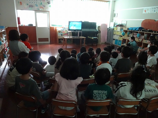ゆり組(4歳児)、ひまわり組(5歳児)さんは火遊びから火事になった火を消してくれる犬の消防隊のDVDを見ましたよ😊みんな夢中です