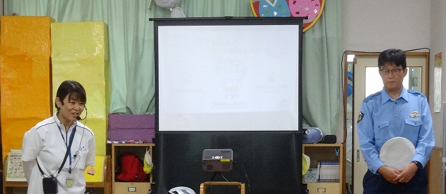 最初にひまわり組さんは、保育室で南署交通安全課のおまわりさんと高知市役所のくらし交通安全課の指導員さんのお話しを聞きました。