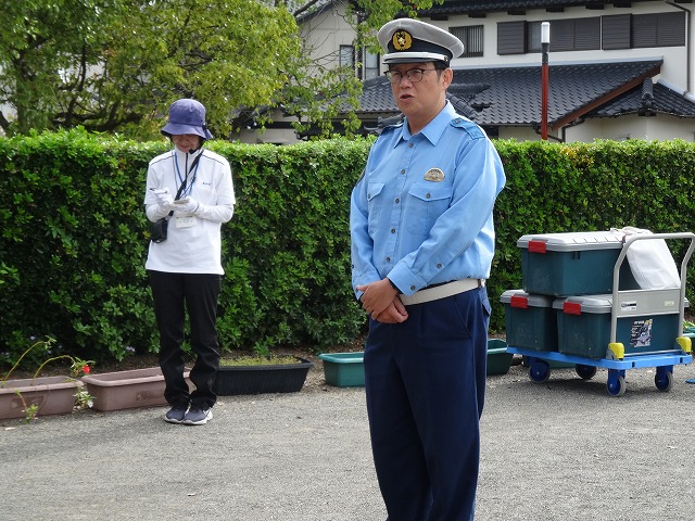 園庭では、ゆり組さんとすみれ組さんが、高知市役所のくらし交通安全課の指導員さんのお話しを聞きました。
