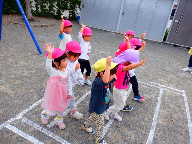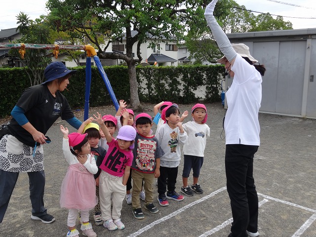 運動会ごっこの最初は、ゆり組さんの踊り「勇気100%」をみんなで踊りました。