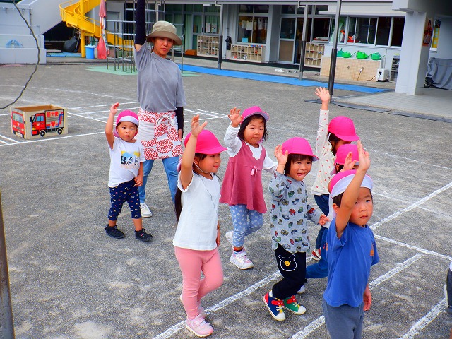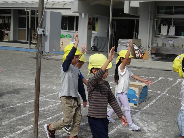 みんなお話しを聞いて、手をピーンと挙げて、真剣に道の渡り方を学んでいましたよ。これから、お散歩の時など、実際の道路で子どもたちと一緒に確認しながら、道を渡りたいと思います😊