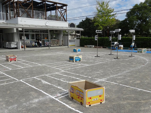 その後、園庭に作った道路で、道の渡り方を教わりました。