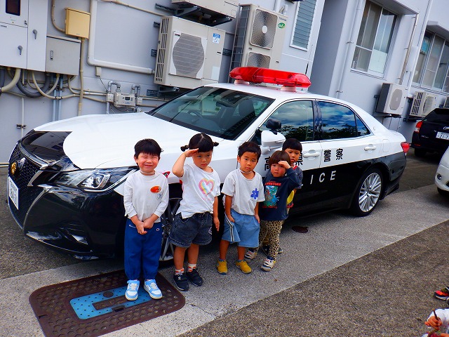 保育室でのひまわり組さんのお話しのあと、おまわりさんが園庭にも来てくれました。おまわりさんが交通安全課の仕事は…と話し始めると、子どもの中から「どろぼうを捕まえる!」と声が上がりました(笑) するとおまわりさんが「どろぼう…もそうだけど、交通安全のお仕事もしています。ルールを守るようにして下さいね」とお話ししてくれました。
