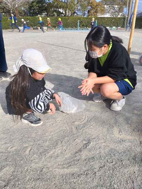 自慢の泥だんごを見てもらったり、向こうの方では鬼ごっこをしていますよ