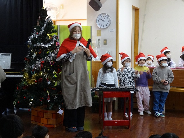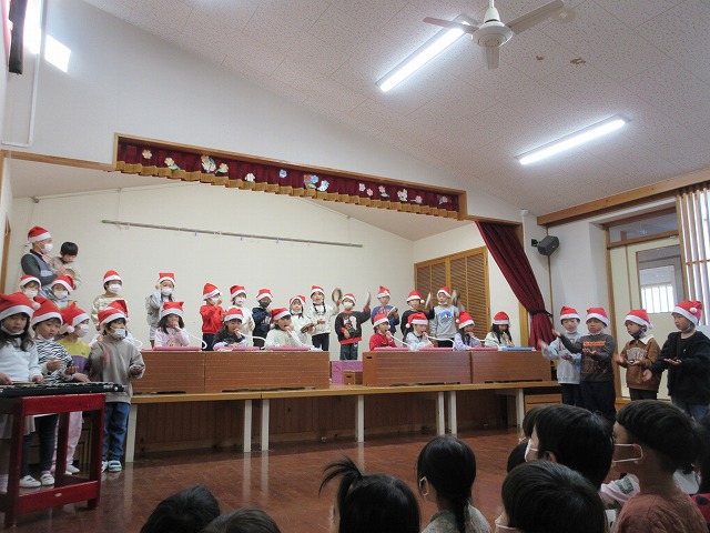 次に、ひまわり組さんが合奏「ジングルベル」を披露してくれました。とっても上手な演奏で、聞いている子どもたちも目を輝かせて見つめていましたよ。ひまわり組さん、ステキな合奏をありがとう!