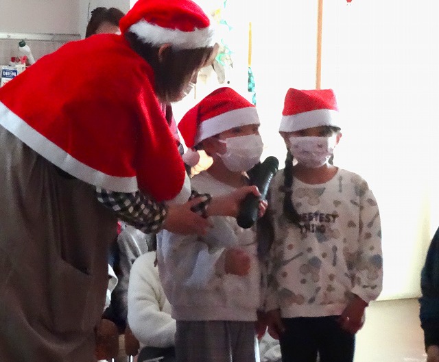 年長児さんがサンタさんに「何歳ですか?」「どうやって空を飛んでますか?」と質問しました