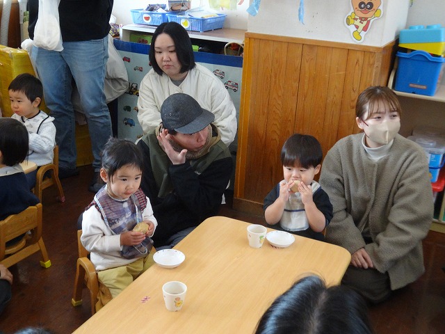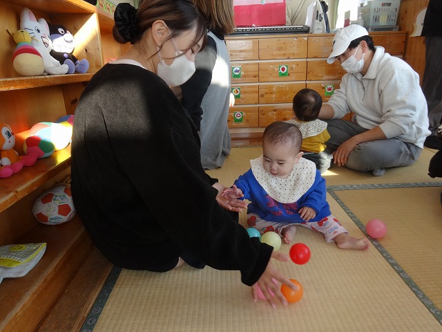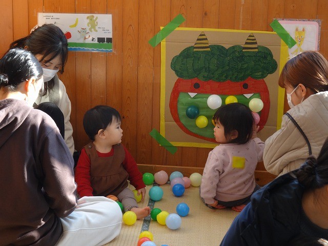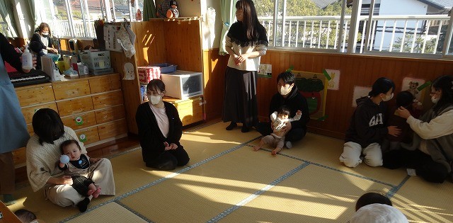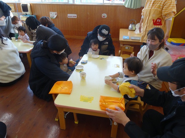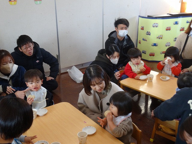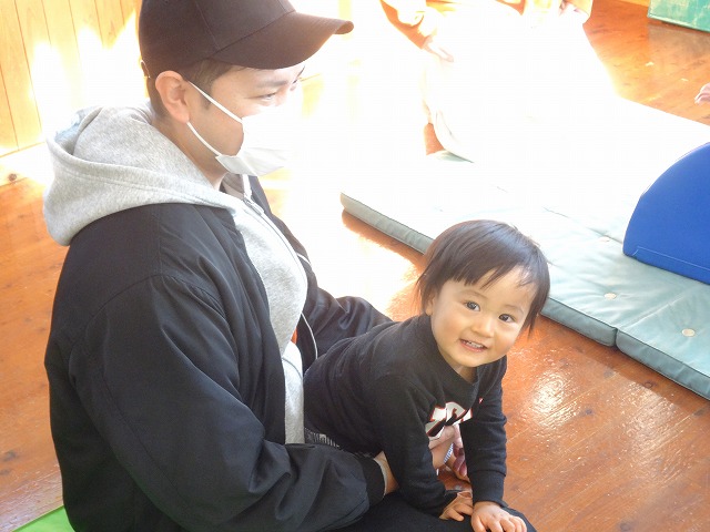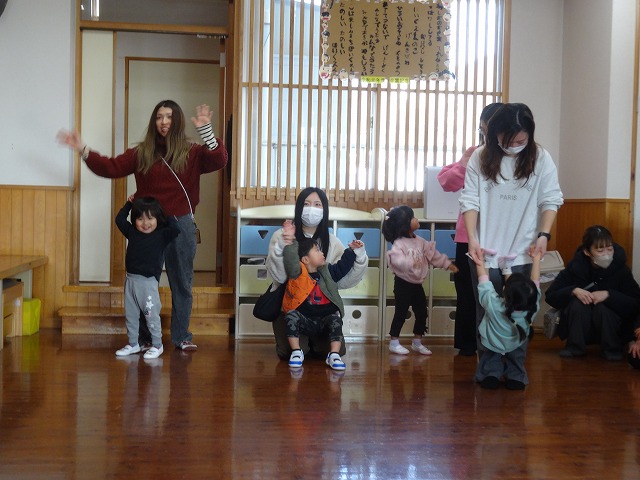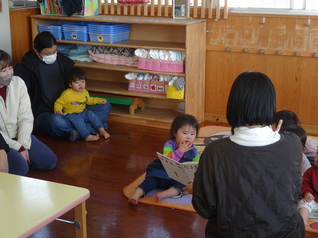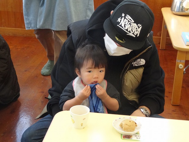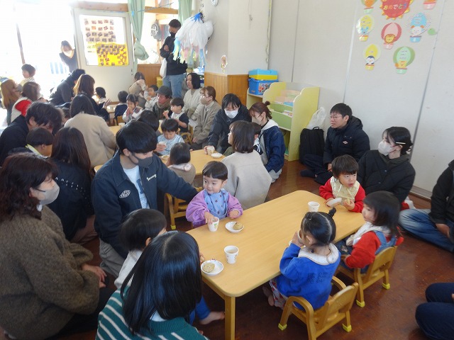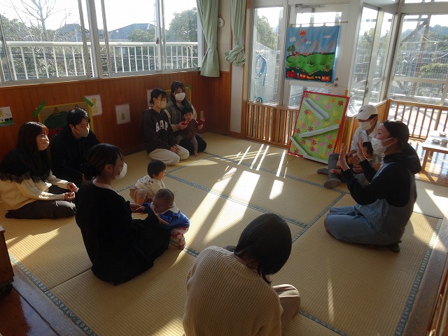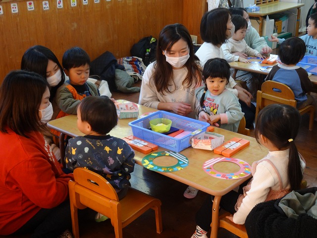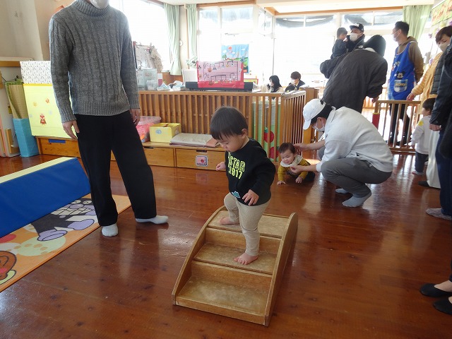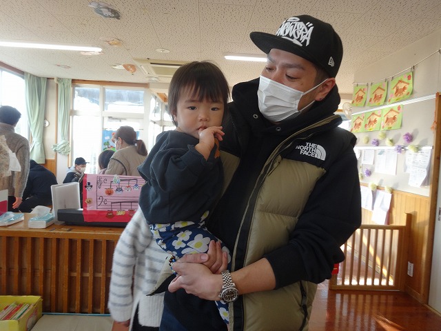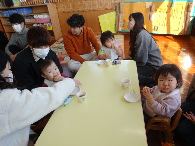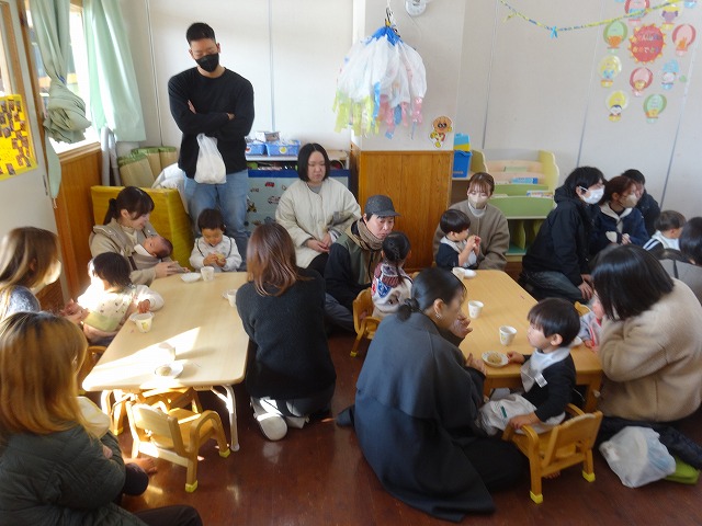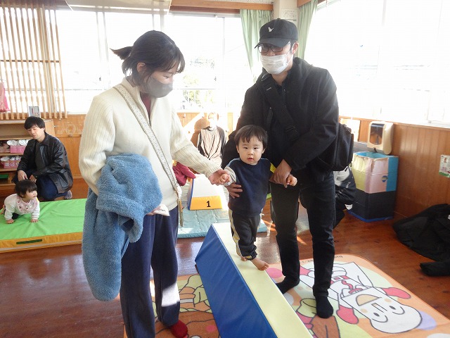 1月24日(土)、ミニチューリップ組(0歳児)・たんぽぽ組(1歳児)・もも組(2歳児)の参観日がありました。子どもたちはいつもと違う雰囲気に少しドキドキしながらも、お父さんやお母さんと一緒に過ごせることがとても嬉しそうでした。