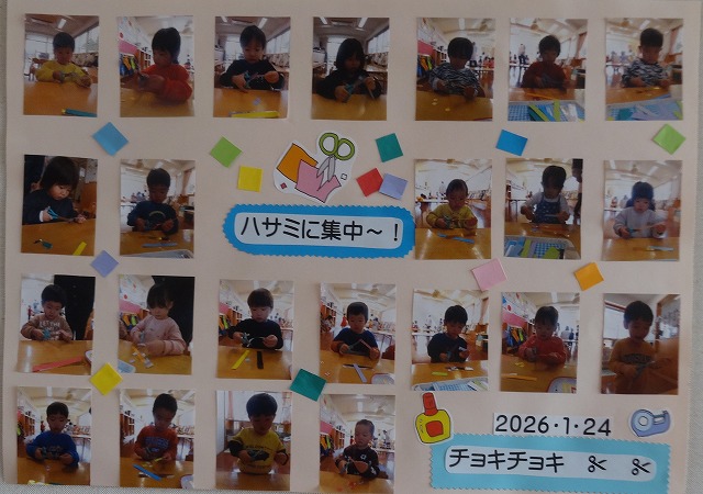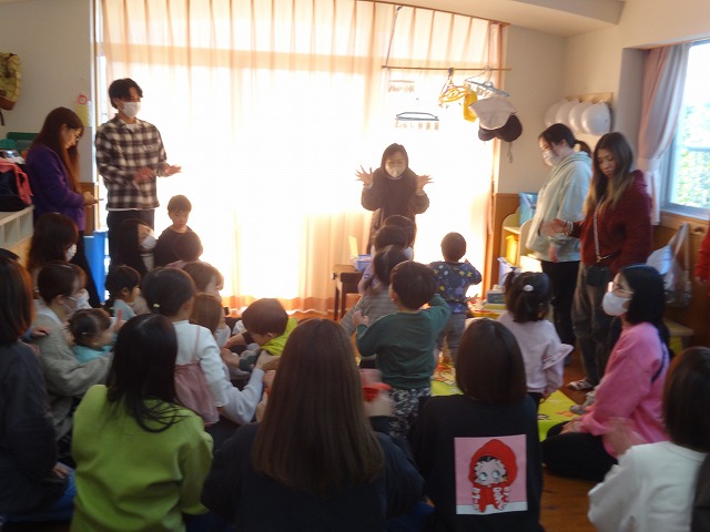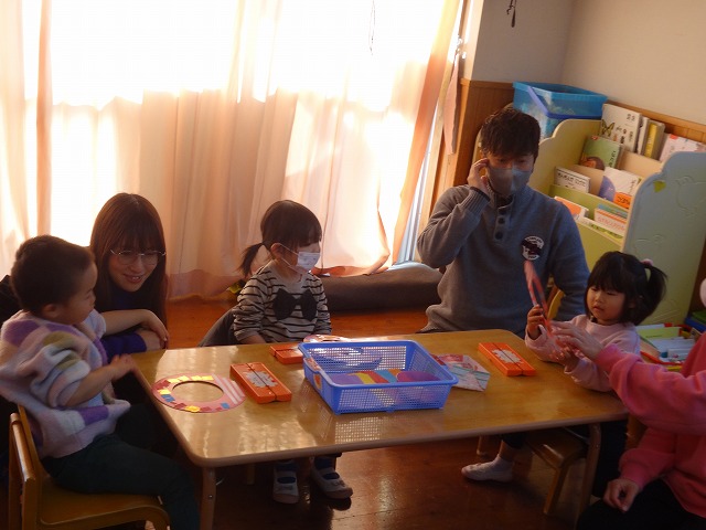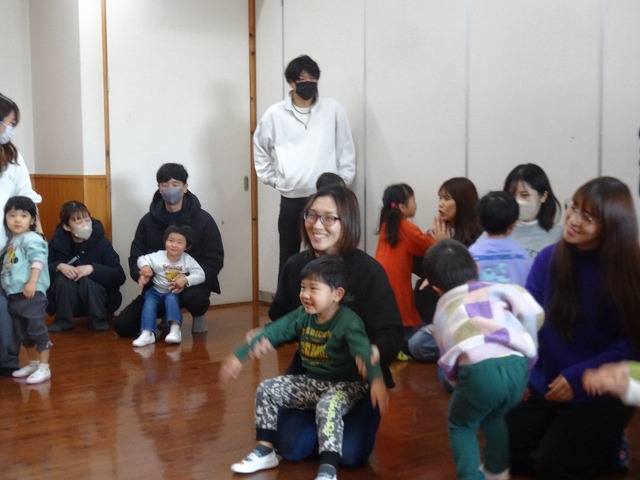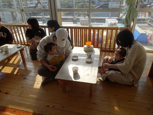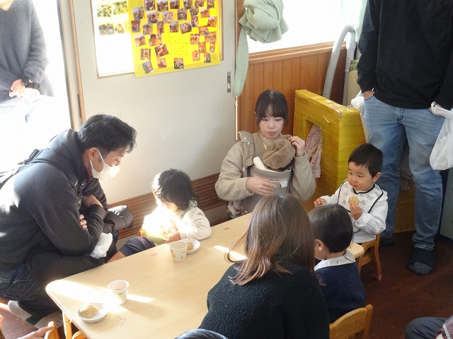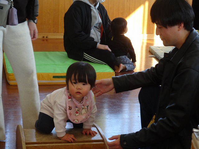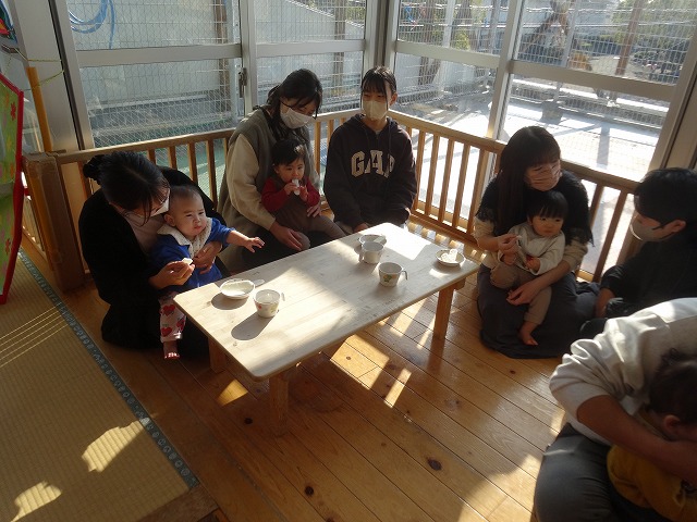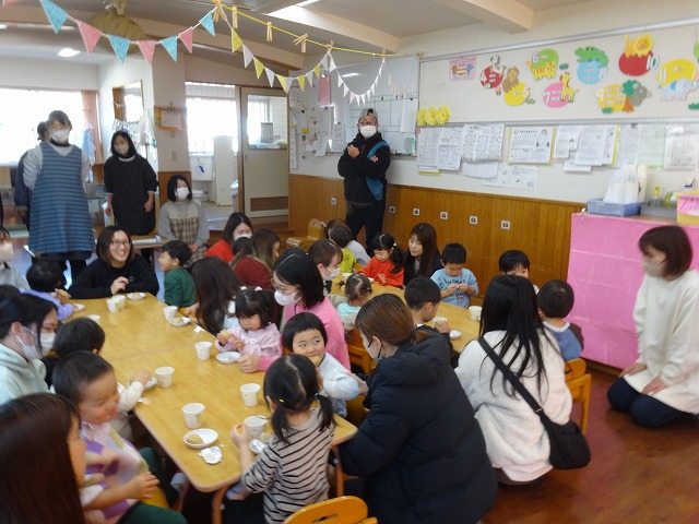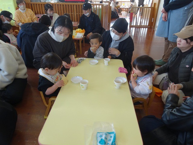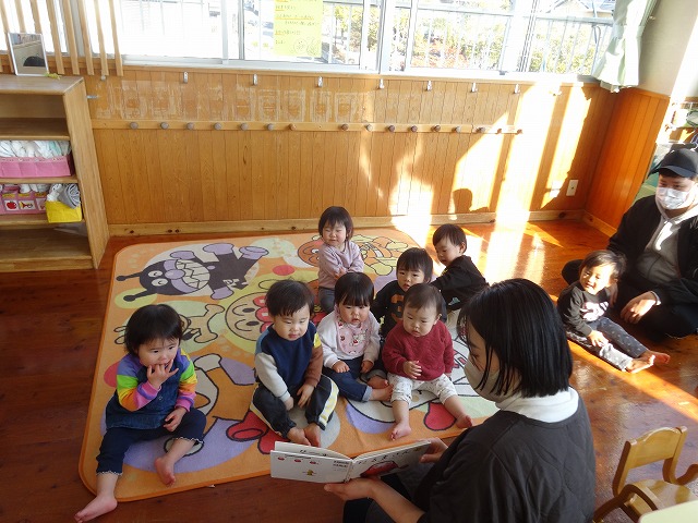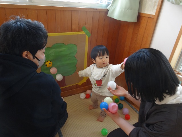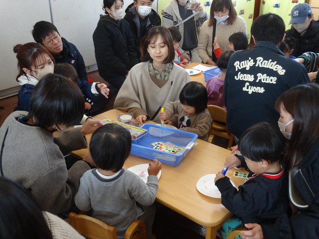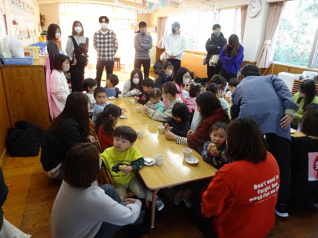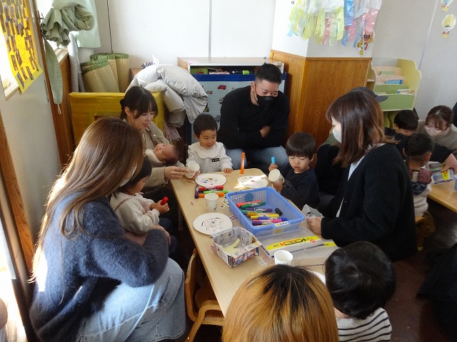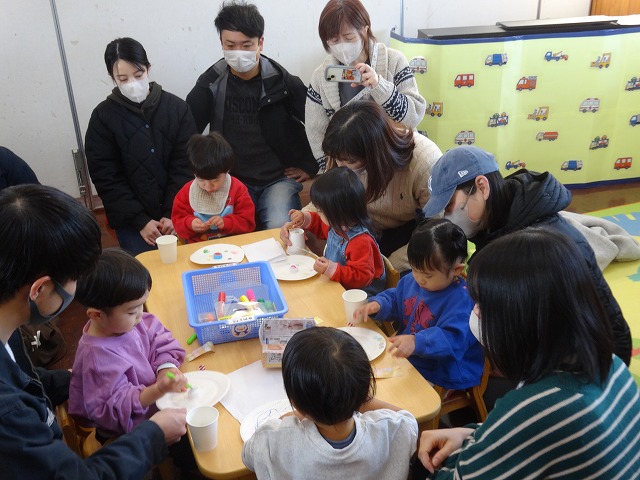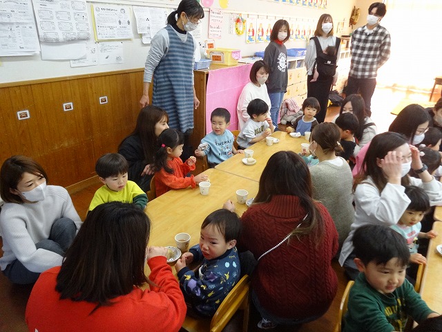 1月24日(土)、ミニチューリップ組(0歳児)・たんぽぽ組(1歳児)・もも組(2歳児)の参観日がありました。子どもたちはいつもと違う雰囲気に少しドキドキしながらも、お父さんやお母さんと一緒に過ごせることがとても嬉しそうでした。