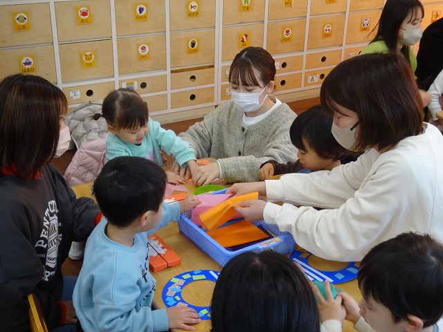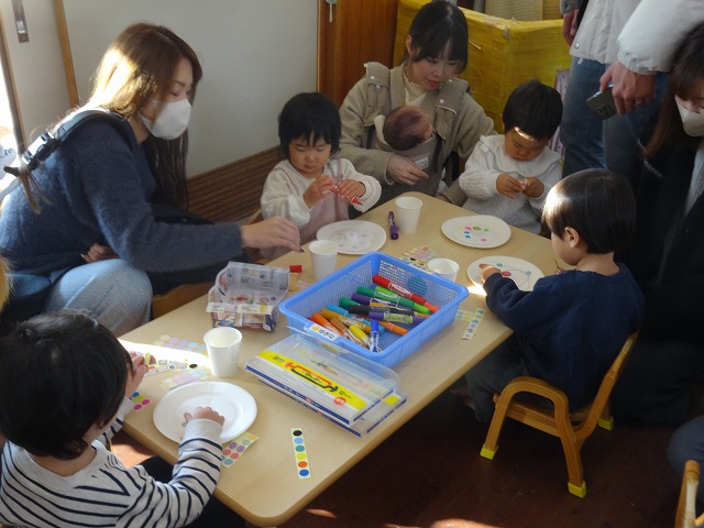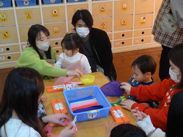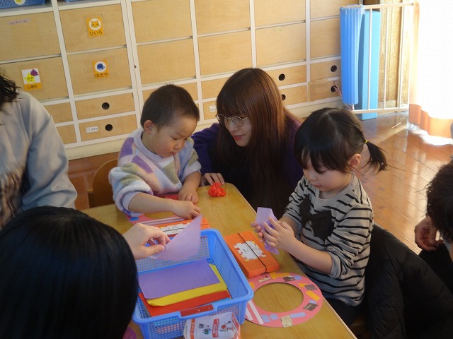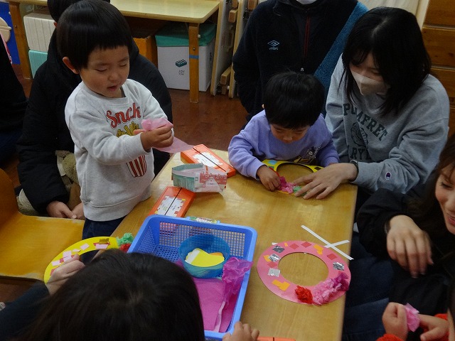 お父さんやお母さんに見守られながら、製作をしました。(色紙をハサミで切って糊で貼るところまで済ませている台紙を使いました)