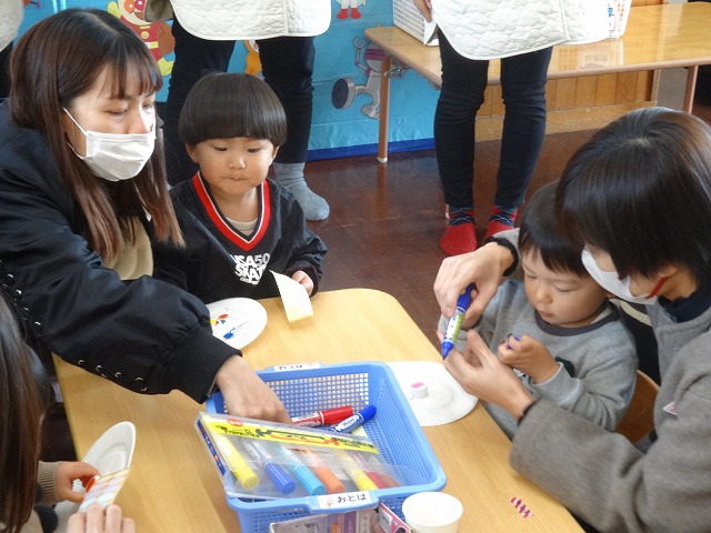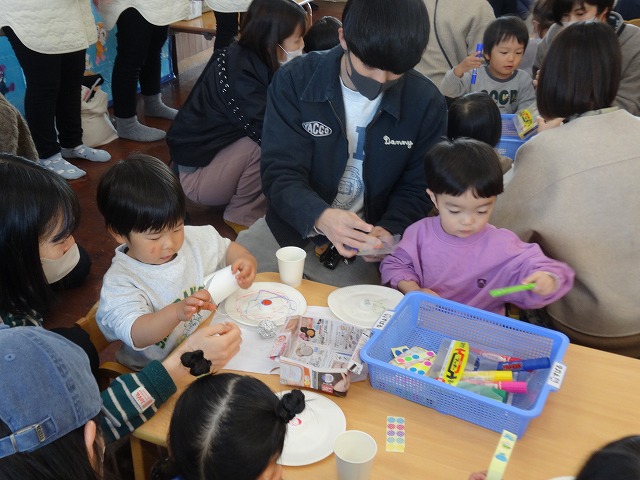 親子で一緒に製作をしました。紙皿や紙コップにシールを貼ったり好きな色のマーカーで描いたよ😊