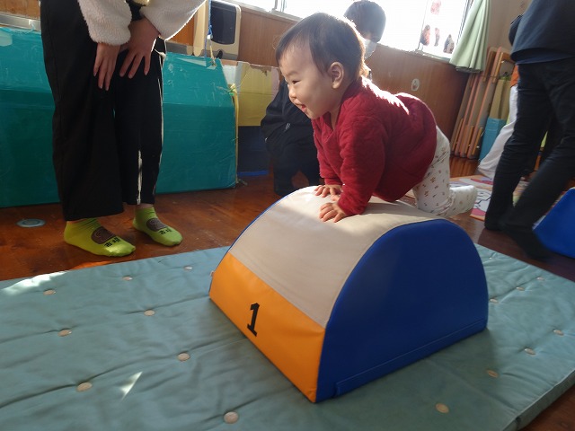 日頃遊んでいるマットや階段、ボールなどを用意すると、お父さんやお母さんに見守られながら、いつものようにのびのびと遊ぶ子どもたちでした。