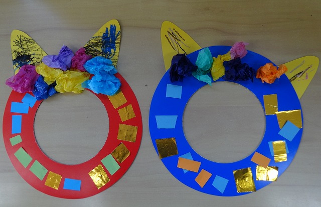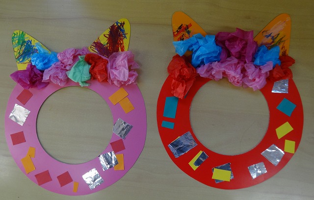 おはな紙を丸めたものをくっつけたり、好きな色のクレパスで模様を描いたら、ジャジャーン!鬼のお面の出来上がり✨カラフルでとってもステキなお面ですね😊
