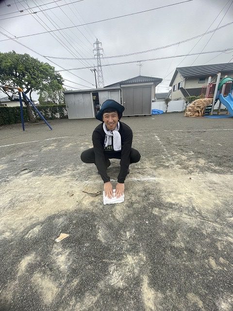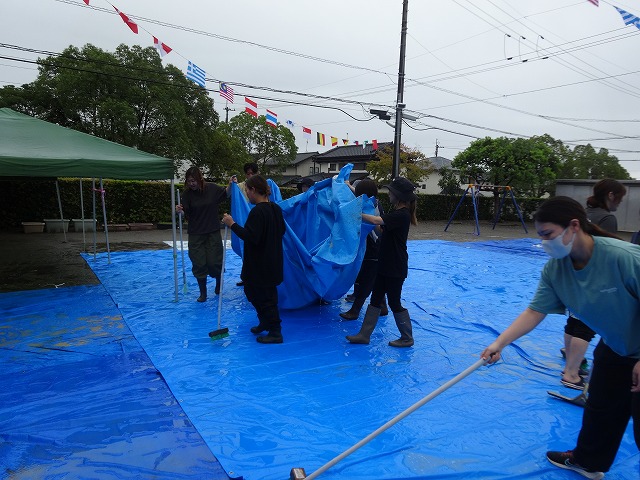 運動会当日の朝、予報と変わり雨は降り続いていました。雨雲レーダーと再びにらめっこ!予報を見ながら検討した結果、開始時間を遅らせて運動会を行うことを決定しました。雨が小ぶりになった10時頃から、園庭のブルーシートを外して、溜まった水を雑巾で吸い取りました。