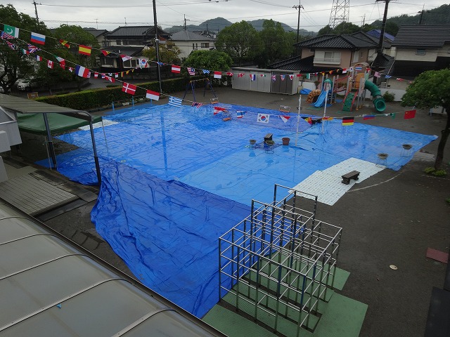 運動会前日の夕方は雨が降っていましたが、雨雲レーダーによると10月4日の朝方から雨雲がなくなる予報でしたので、運動会に向けて少しでも水浸しならないように、保護者の方にもご協力頂きながら園庭をブルーシートで覆いました。