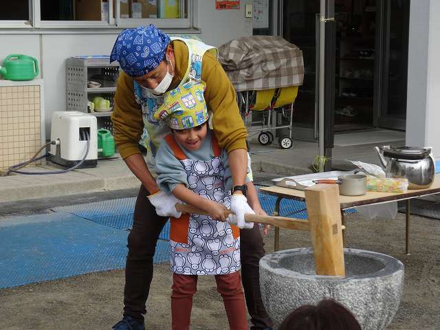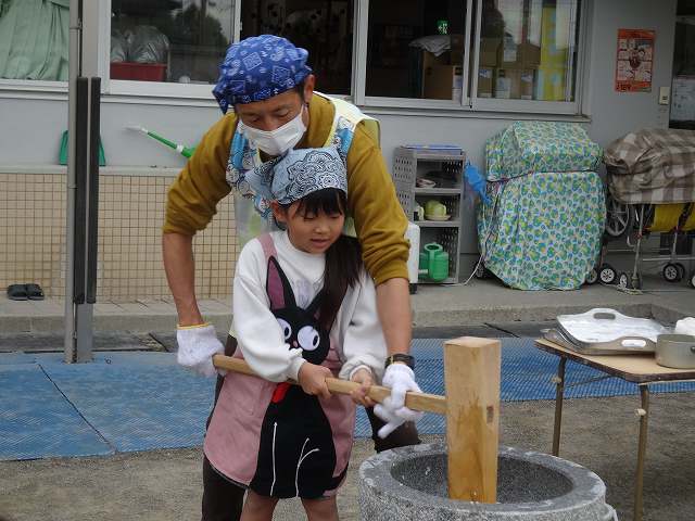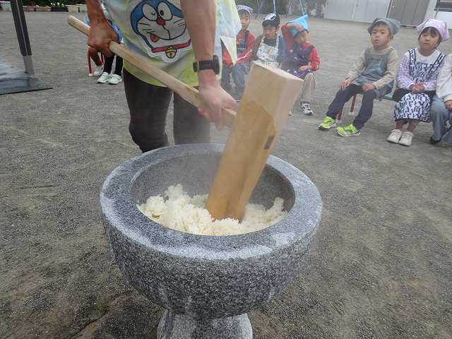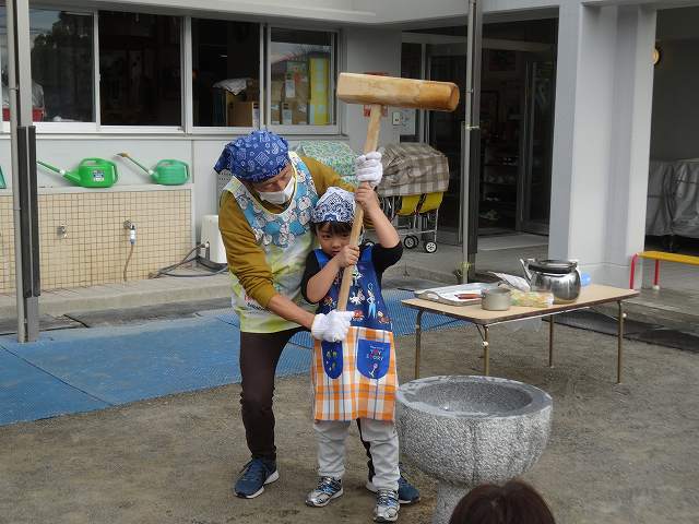 ひまわり組さんのお餅つきが始まりました。