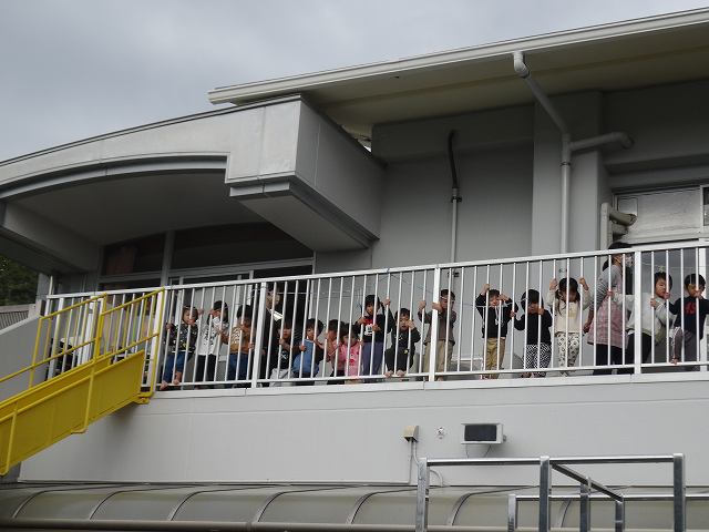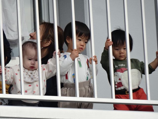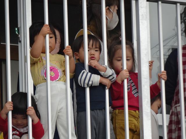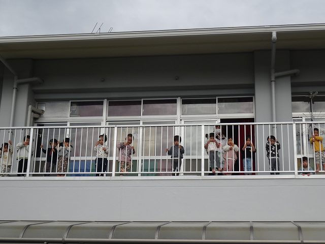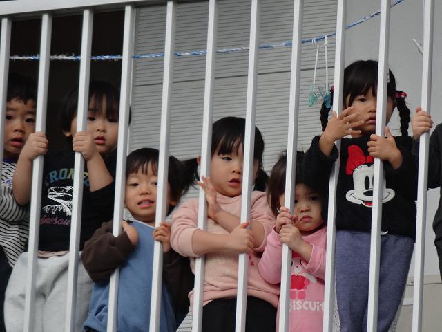2階テラスから乳児組さんも興味津々で見ていますよ。