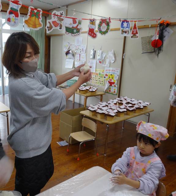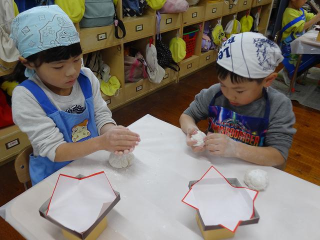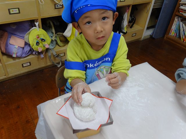 12月24日(水)、ひまわり組(5愛児)さんがお餅つきをして、飾り餅を作りました。