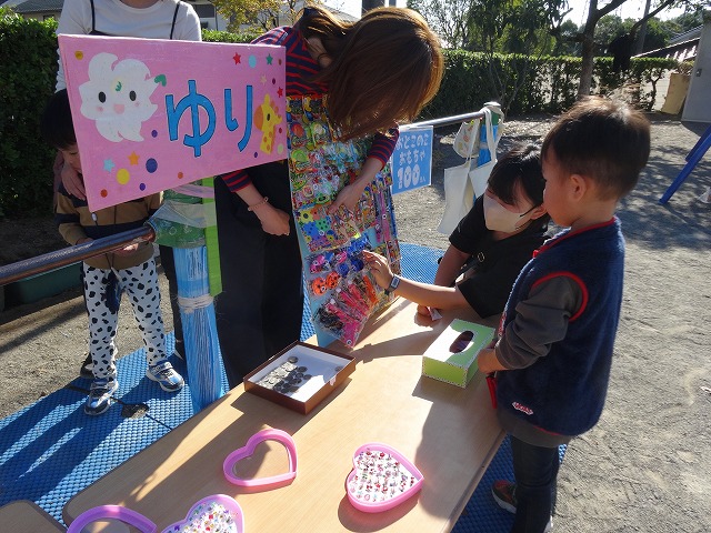ゆり組さんは保育室を歩き、音楽が止まった時に目の前にいるお友だちと手作りのキャンディの交換です