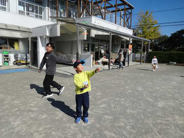 保育園に帰って来ました。「あっ!何かある♪」小石や落ち葉、目に止まった物が何でも気になってしまうお年頃です(笑)
